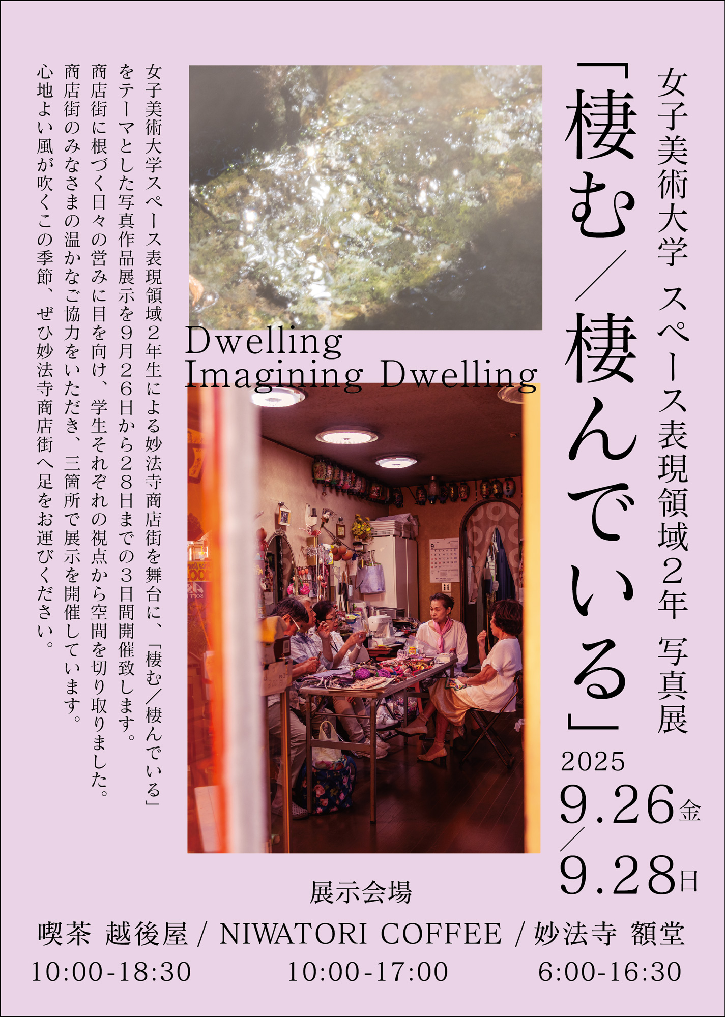 女子美術大学スペース表現領域2年生が妙法寺商店街を舞台に、「棲む/棲んでいる」をテーマとした写真作品展示を9月26日から28日までの3日間開催致します。商店街に根づく日々の営みに目を向け、学生それぞれの視点から空間を切り取りました。商店街のみなさまの温かなご協力をいただき、三箇所の会場で展示を開催しています。心地よい風が吹くこの季節、ぜひ妙法寺商店街へ足をお運びください。